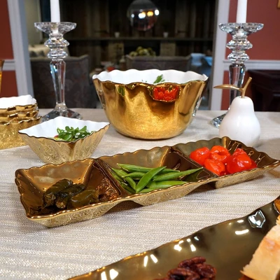 This elegant Gold Coast serveware from Certified International looks like metal but is actually metallic glazed durable porcelain ! This exciting collection features uniquely shaped yet functional serveware such as a generously sized platter, deep bowl, chip & dip, 4 pc condiment set , sectional server, cracker tray and Set of 4 Snack Bowls. The rich gold metallic finish is food safe, stain, scratch and tarnish resistant. Impress your family and guests with these beautiful pieces which complement any table setting!