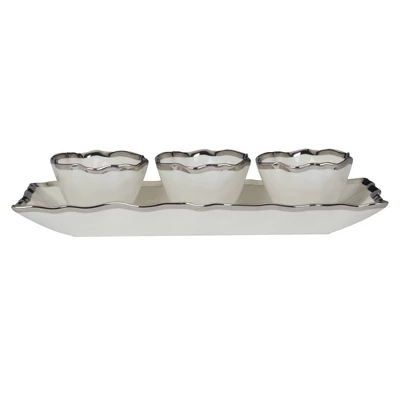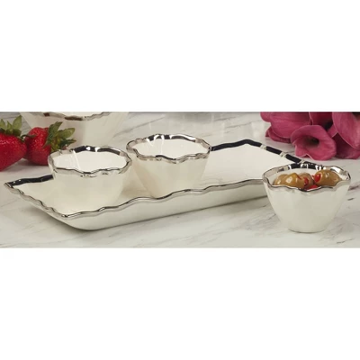 Enhance your hosting game with the Regency silver 4pc Tray and Condiment Bowls set, an indispensable ensemble for any sophisticated host. This exquisite set is designed to impress, making it a fabulous choice for serving condiments, dips, or snacks in a stylish manner. Pair with other pieces of the Regency collection for a stunning presentation.