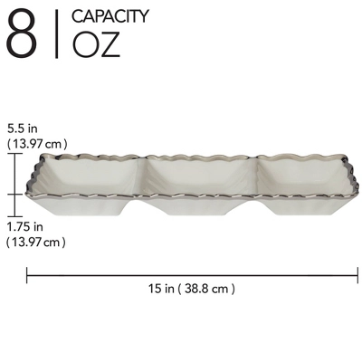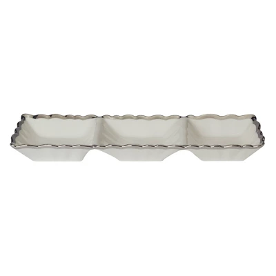 Present your favorite appetizers and snacks with unmatched elegance using the Regency silver 3 Section Tray. This beautifully designed 15″ x 5.5″ tray is perfect for hosting, enabling you to serve a variety of treats in style, from olives and nuts to an assortment of candies. Pair with other pieces of the Regency collection for a stunning presentation.