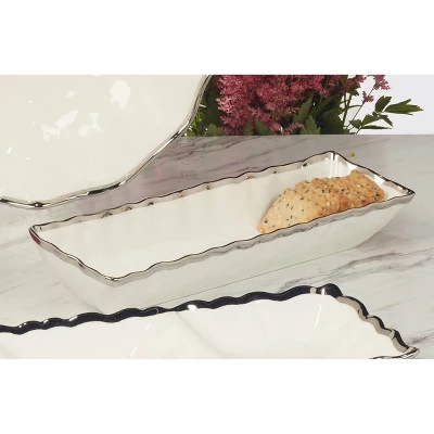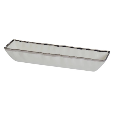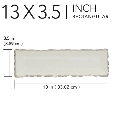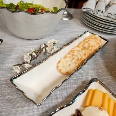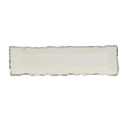 Enhance your serving essentials with the exquisite Regency silver Cracker Tray, a perfect blend of form and function. This 13″ x 3″ porcelain tray, adorned with a stunning silver trim, provides an elegant and streamlined way to serve crackers, breadsticks, or any other slender appetizers. Pair with other pieces from the Regency collection for a stunning look.
