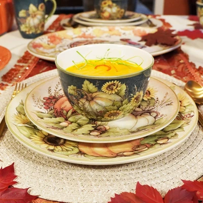 Heighten your dining experience with the Autumn Breeze 16pc Set, where each 11″ dinner plate is a canvas that celebrates the bounty and beauty of the season. The rich, warm palette of sunflowers and pumpkins etched onto each plate is not merely a design but an invitation to embrace the cozy charm of autumn. These plates are not just dinnerware; they’re a statement piece for your home, versatile enough to mix and match with other exquisite dinnerware and serveware from the collection. Whether setting them out as a part of a festive home decor display or wrapping them up as thoughtful gifts, the Autumn Breeze set is sure to enchant and delight. The artistry in each plate promises to turn every meal into a more beautiful, memorable event, reflecting the best of the harvest season.