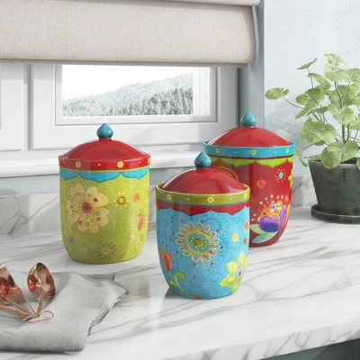 Brighten your kitchen with these vibrant colors from Certified International’s Tunisian Sunset Dinnerware Collection. This 3 piece canister set features a variety of floral design with bright colors to give your room a cheerful ambiance. Store everything from flour to sugar to tea to treats. Pair with other pieces from the Tunisian Sunset collection to complete the look.